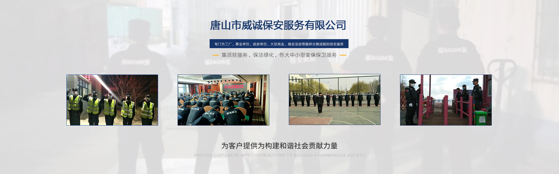 唐山市威誠(chéng)保安服務(wù)有限公司自成立以來以“嚴(yán)防死守、忠于業(yè)主”為服務(wù)原則,以“客戶滿意、 合作共贏”為根本目標(biāo)。以科學(xué)的管理、多方位多層次的服務(wù),建立了首問責(zé)任制,完善了走訪、回訪 、滿意度調(diào)查、末位淘汰的預(yù)警管理,不斷提高服務(wù)質(zhì)量,提高業(yè)主滿意度,提高企業(yè)形象。秉承“誠(chéng) 實(shí)守信,紀(jì)律嚴(yán)明,團(tuán)結(jié)協(xié)作,致精致誠(chéng)”的服務(wù)理念,為客戶提供高品質(zhì)、多方位、專業(yè)化的保安服務(wù)。 本公司制定了嚴(yán)謹(jǐn)?shù)亩ㄏ蛘猩?、崗前培?xùn)、考核錄用、崗中培訓(xùn)、持續(xù)培訓(xùn)、末位淘汰制等一整套完善的管理體系??梢愿鶕?jù)客戶的要求實(shí)地勘察評(píng)估,以量身定做的方式提供安保防范服務(wù)。